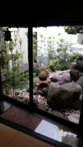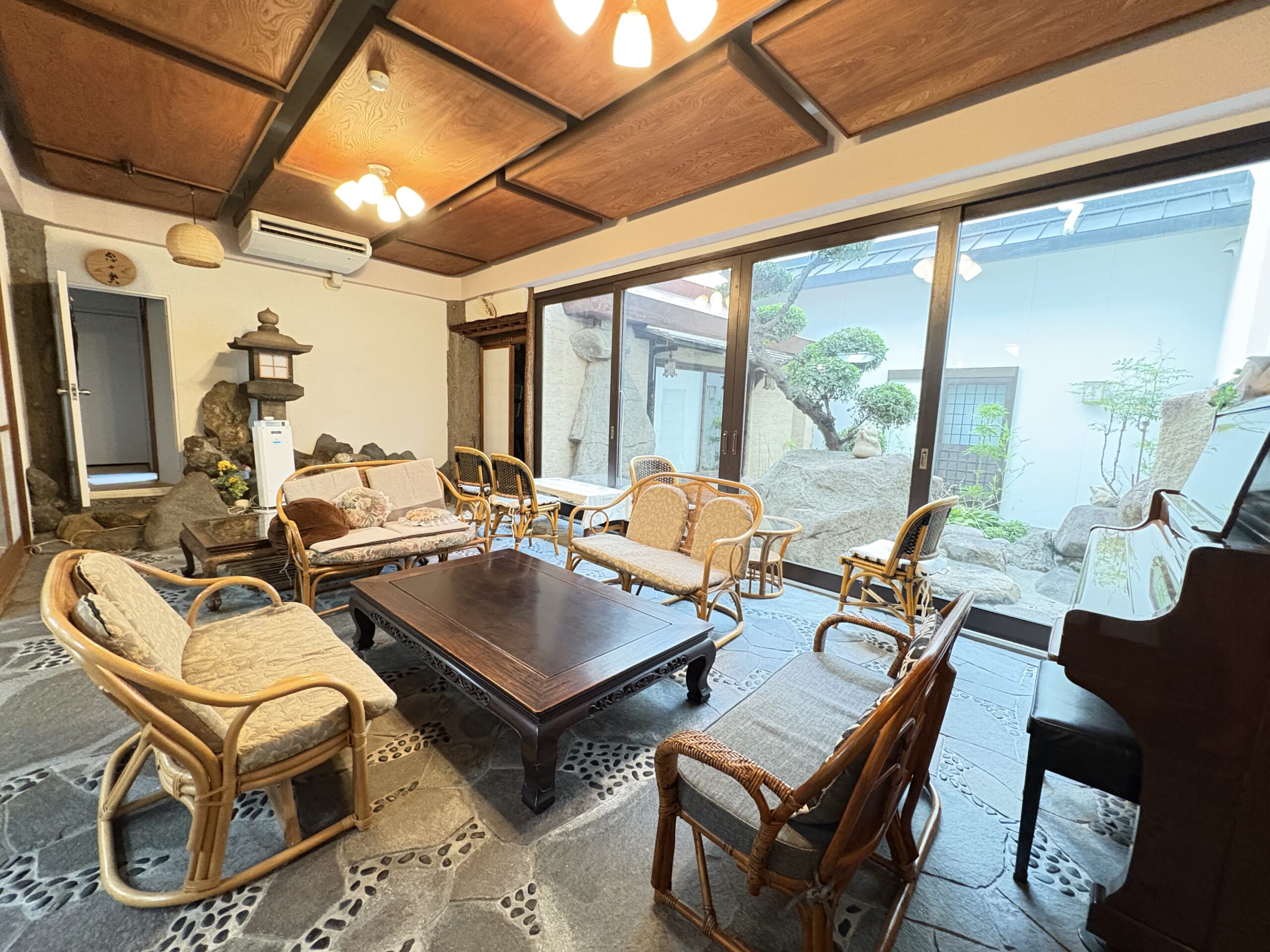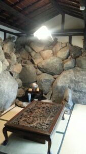 受念館創始者による趣向を凝らした石の間。お話ししたり、ピアノ会をしたり、いろいろな用途に。